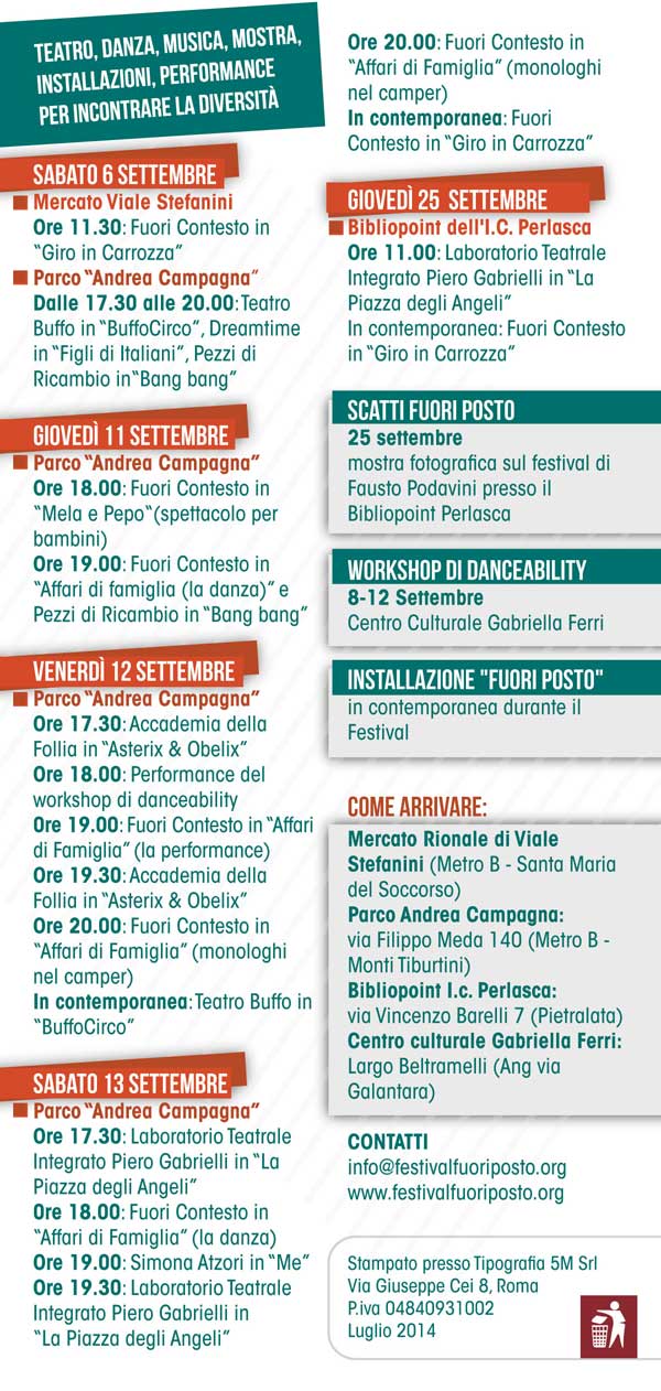 Inserita nella programmazione ESTATE ROMANA 2014, la manifestazione FUORI POSTO. FESTIVAL DI TEATRI AL LIMITE è organizzata dalla Coop. Sociale Eureka I ONLUS e dall'Associazione culturale Fuori Contesto. Realizzata con il sostegno di Roma Capitale in collaborazione con Acea e Siae.